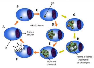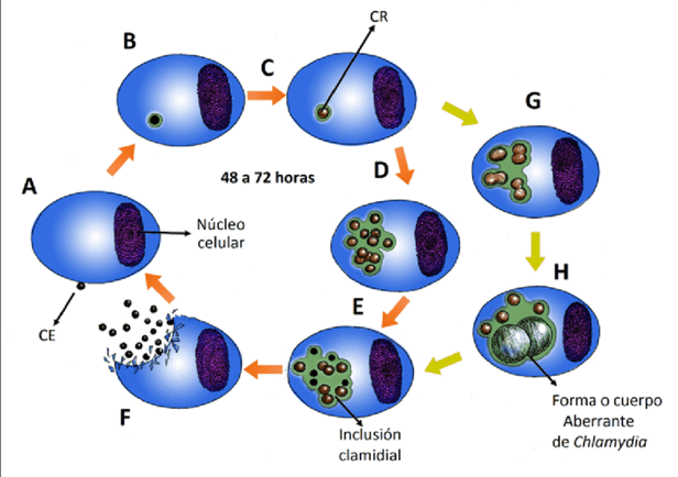 I corpi elementari aderiscono alla membrana della cellula ospite ed entrano per endocitosi, formando corpuscoli diminuti avvolti da una membrana. Cambiano il loro metabolismo, si differenziano in corpi reticolari e si replicano esponenzialmente attraverso la fissione binaria. Ciò si verifica 6-8 ore dopo l'infezione. Possono quindi interrompere il loro processo e rimanere in uno stato dormiente (corpi aberranti), oppure differenziarsi nuovamente in corpi elementari per essere rilasciati dalla cellula. Ciò avviene attraverso due processi esclusivi: la lisi della cellula infetta o l'esocitosi, che avvengono tra le 48 e le 72 ore dall'infezione. I corpi elementari rilasciati hanno la capacità di infettare le cellule della mucosa vicine e il ciclo intracellulare viene riavviato.